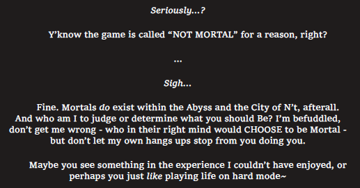 ... Look, I know I just waxed poetic for a few paragraphs in the game about challenging Mortality as a rule, but Mortals DO still exist, and to NOT make something like this would be some kind of erasure, right?